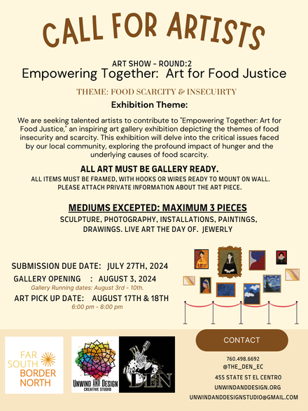 Join us for a cozy community get-together featuring live music, an open mic, and collaborative artwork presented by the FSBN SDSU IV Team through Unwind & Design Creative Studio. We'll discuss food insecurity and scarcity with interactive art to spark meaningful conversations. Enjoy a fun summer night surrounded by art, music, good vibes, and engaging dialogue. Don’t miss this chance to connect, create, and converse in a vibrant and supportive environment!