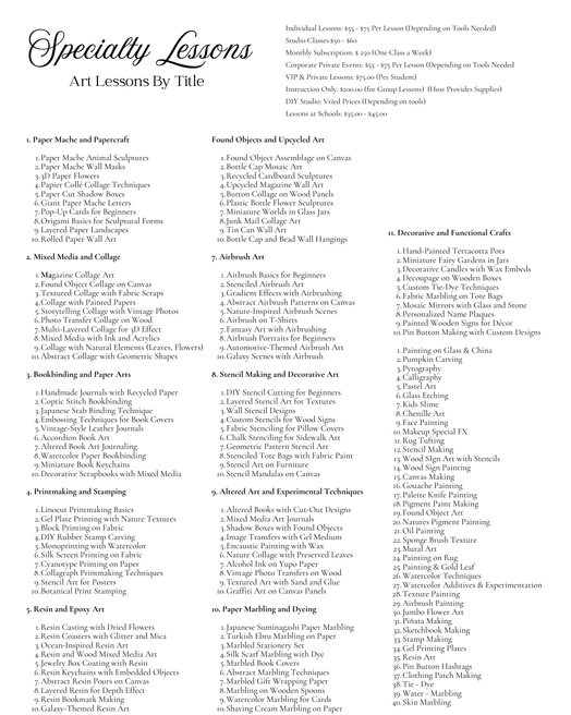 Schedule a lesson with one of our specially trained artist, for a 1 on 1 lesson doing any of the specialty classes below. You choose the theme and we teach you how to do it. We have art option of art available for you to choose from or you can bring something of your own interest and we will do our best to accommodate what you want to learn.